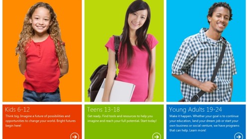 Como parte de la iniciativa, Microsoft también lanzará nuevos programas de ciudadanía: Give for Youth, un sitio global de micro donaciones dedicado exclusivamente a reunir fondos para las organizaciones sin fines de lucro que apoyan a los jóvenes en todo el mundo; Microsoft YouthSpark Hub, un espacio en línea donde los jóvenes pueden explorar y acceder a todos los servicios, programas y recursos que ofrecen Microsoft y las organizaciones sin fines de lucro con las que tiene alianzas; y Microsoft Innovate for Good, una comunidad global en línea que permite a los jóvenes colaborar, motivarse y apoyarse entre sí conforme utilizan la tecnología para marcar una diferencia en sus comunidades.